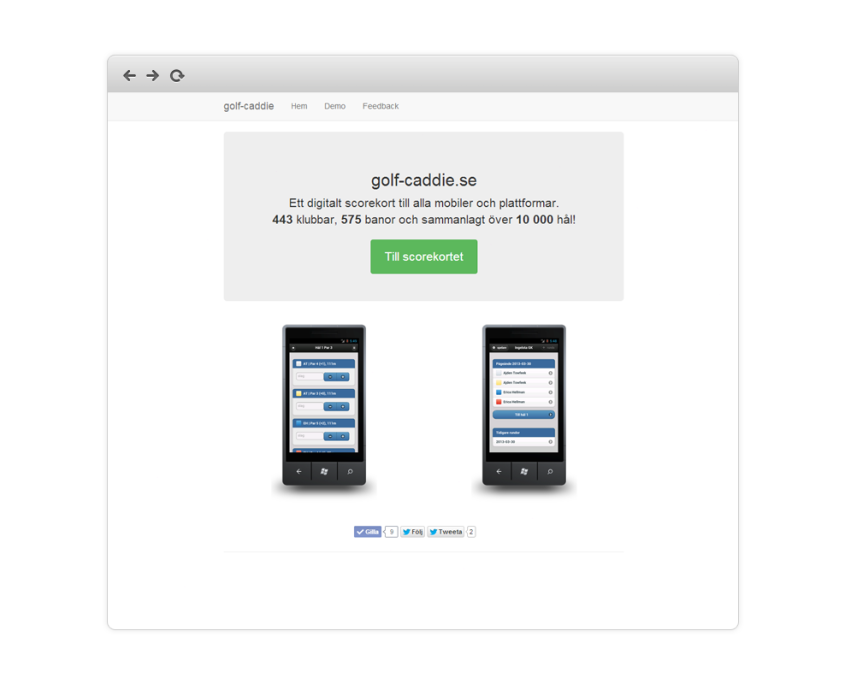 A scorecard web application for golf. The application is unique with targeting all available platforms and supports offline usage. Today it contains nearly all golf courses in Sweden and works on all smart phones with a browser. An in-house project with so far about 100 unique users.
